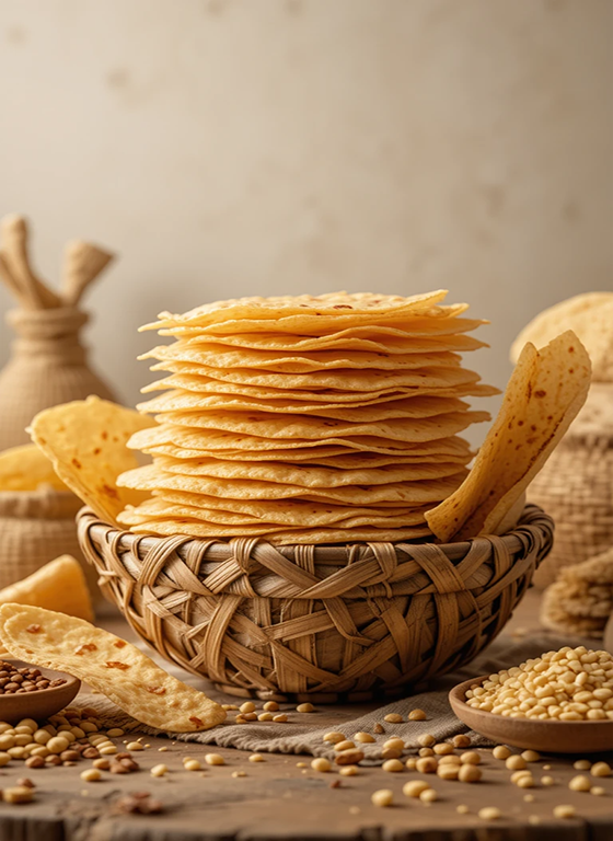 At Tamrasan Premium Appalam, we are dedicated to bringing you the authentic taste of traditional Tamil Nadu Appalam. Our journey started with a passion for quality, tradition, and flavor, ensuring that every bite of our handcrafted Pepper Appalam, Jeera Appalam, and Plain Appalam is a true delight.